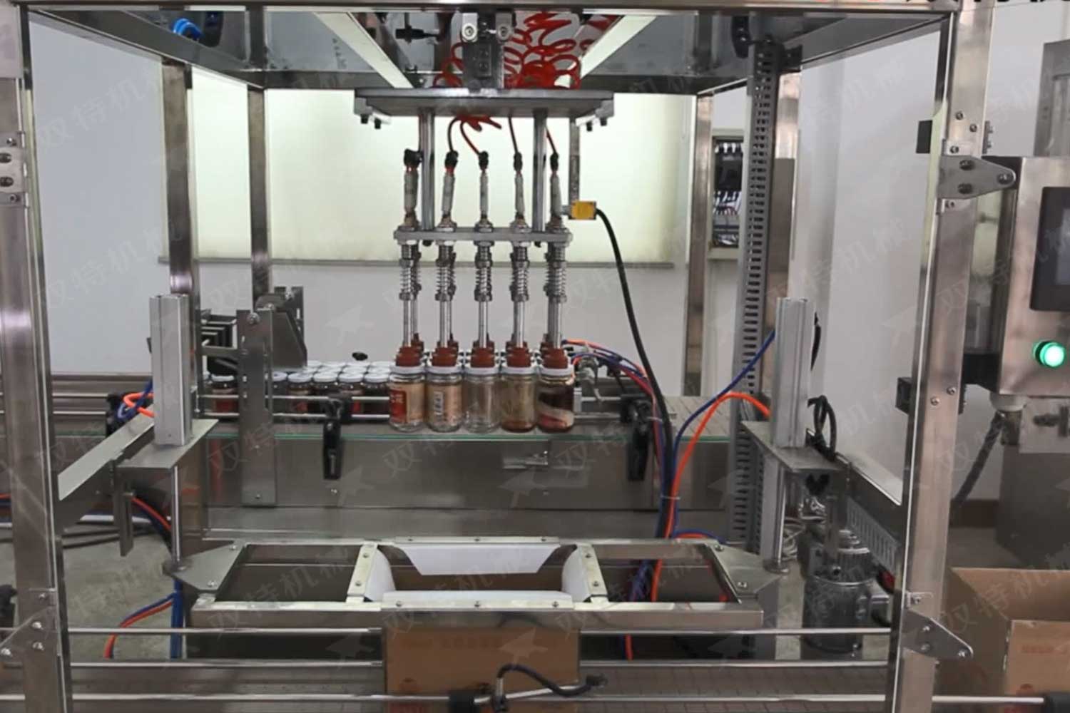 旋蓋機(jī)主要用于玻璃廣口瓶的三、四、六鐵蓋真空旋蓋,用兩根不同速度的皮帶壓瓶蓋,因兩根皮帶的速度不同,對(duì)蓋進(jìn)行搓蓋收緊達(dá)到旋蓋目的。在自動(dòng)上蓋之前對(duì)瓶口吹蒸汽加熱,吹掉冷空氣,換上高溫蒸汽,立即旋蓋,根據(jù)熱脹冷縮原理,蒸汽冷下來就自然形成了瓶?jī)?nèi)真空,達(dá)到了真空旋蓋的目的。自動(dòng)旋蓋機(jī)可以和濃醬灌裝機(jī)、蜂蜜灌裝機(jī)、辣椒醬灌裝機(jī)組合在一起,形成一套全自動(dòng)灌裝設(shè)備,是現(xiàn)代調(diào)味品企業(yè)的得力幫手。
